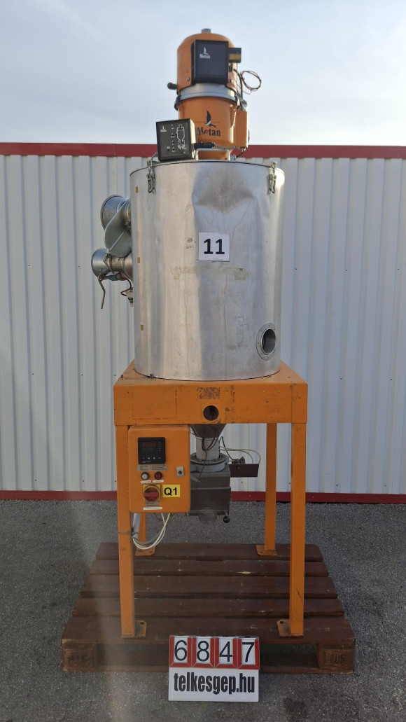 Granulátum szárító, granulátum felszívó, Motan NS-D05-ST-2-PO-SL-0020, Használt gép Gyártó: Motan Típus: NS-D05-ST-2-PO-SL-0020 Befoglaló méretek: Szélesség: 750 mm Mélység: 950 mm Magasság: 2500 mm Elektromos adat: 230V; 2kW Tartály méret: 300 liter Vákuumos felszívóval és előmelegítővel ellátva - További információk