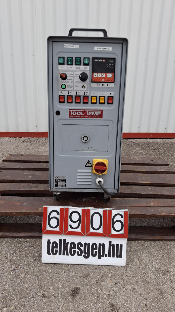 Temperáló,Folyadék temperáló,Ipari temperáló, Thermolator, Tool-Temp TT168 E, Használt gép Gyártó: Tool-Temp Típus: TT 168 E Teljes méretek: 710 × 325 × 785 mm (kerekekkel és fogantyúkkal együtt) Szín: Ezüstszürke RAL 7001 Súly: kb. 67 kg (üresen) Tulajdonságok: Önoptimalizáló elektronikus mikroprocesszoros vezérlő (MP-888) Digitális kijelző a beállított és tényleges értékekhez Automatikus hőmérséklet-ellenőrzés Elektronikus áramlásszabályozás digitális kijelzővel Automatikus minimum áramlás-ellenőrzés Alkalmas víz és olaj közeghez egyaránt Maximális hőmérséklet-tartomány: Víz: 90 °C Olaj: 150 °C Fűtőteljesítmény: Víz: 12 kW / 18 kW (fokozatok: 3/9, 9/9) Olaj: 6 kW (fokozatok: 3/3) Hűtőteljesítmény: 45 kW 90 °C-on Szivattyúkapacitás: Motor: 0,75 kW Nyomás üzemmód: max. 4,0 bar | max. 60 l/perc Vákuum üzemmód: max. 8 m H₂O Tartálykapacitás: Minimum: 16 liter, maximum: 20 liter Csatlakozások: Közeg: ½" BSP anya Hűtővíz be: ¾" BSP anya (vízszűrővel) Hűtővíz ki: ⅜" BSP apa - További információk