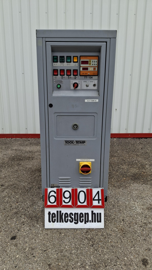 Temperáló,Folyadék temperáló,Ipari temperáló, Thermolator, Tool-Temp TT134, Használt gép Gyártó : Tool-Temp Típus : TT 134 Befoglaló méret : 390 x 1030 x 1070 mm Év : 2012 Tulajdonságok : Önvezérlő rendszer(microprosszor) Autómatiku leeresztő rendszer Hőmérséklet felügyelet és jelzés Autómatikus vízfeltöltés Remote és belső hömérséklet szabályozás Automata légtelenítő Víz és olaj közeg működés Max. Hőmérséklet : 140 c° | 18-24 kW Hűtés : 50000 kcal/h Max.nyomás szivattyú : 4 bar | 100 l/m - További információk
