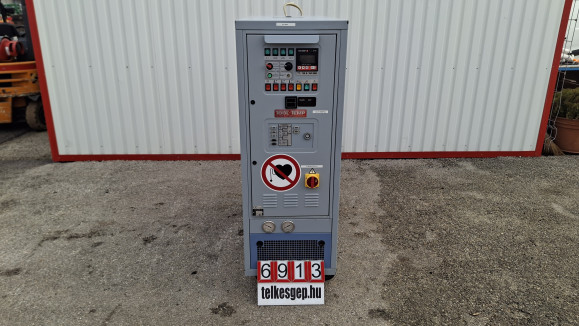 Temperáló, Folyadék temperáló, Ipari temperáló, Thermolator, Tool-Temp TT138 B/BP, Használt gép Gyártó: Tool-Temp Típus: TT 138 B/BP Befoglaló méret: 1240 × 480 × 1400 mm (kerekekkel) Szín: Ezüstszürke RAL 7001 Tömeg: kb. 180 kg (üresen) Tulajdonságok: Önoptimalizáló elektronikus mikroprocesszoros vezérlő (MP-888) digitális kijelzéssel Automatikus hőmérséklet-felügyelet Elektronikus átfolyás-szabályozás digitális kijelzéssel Automatikus minimális átfolyás ellenőrzés Nyomásnövelő szivattyú Hőmérsékletmérés a szerszámon Nyomásmentesítő rendszer Légtelenítés és forma leeresztés sűrített levegővel Automatikus feltöltés Hőmérséklet tartomány max.: Víz: 160 °C Fűtőkapacitás: 24 kW Fokozatok: 6/18 Automatikus kapcsolás az igényelt fűtési teljesítmény szerint Hűtőkapacitás: Indirekt: kb. 85 kW (160 °C-on) Direkt: kb. 60 kW (60 °C-on) Szivattyúkapacitás: Motor: 1,8 kW Nyomó üzemmód: max. 6,5 bar | max. 75 l/min Vákuum üzemmód: max. 8 m H₂O Kivitel: mágneskuplungos, tömítés nélküli Csatlakozások: Közeg: ¾" BSP belső menet Hűtővíz bemenet: 1" BSP belső menet (vízszűrővel) Hűtővíz kimenet: 1" BSP külső menet Sűrített levegő: ¼" BSP belső menet - További információk