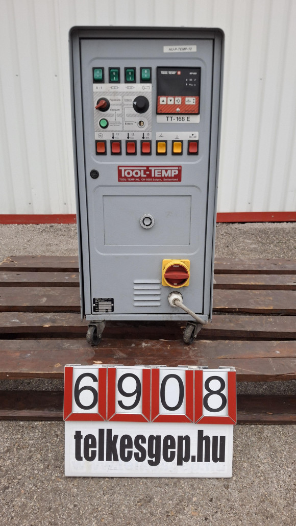 Temperáló,Folyadék temperáló,Ipari temperáló, Thermolator, Tool-Temp TT168 E, Használt gép Gyártó: Tool-Temp Típus: TT 168 E Teljes méretek: 710 × 325 × 785 mm (kerekekkel és fogantyúkkal együtt) Szín: Ezüstszürke RAL 7001 Súly: kb. 67 kg (üresen) Tulajdonságok: Önoptimalizáló elektronikus mikroprocesszoros vezérlő (MP-888) Digitális kijelző a beállított és tényleges értékekhez Automatikus hőmérséklet-ellenőrzés Elektronikus áramlásszabályozás digitális kijelzővel Automatikus minimum áramlás-ellenőrzés Alkalmas víz és olaj közeghez egyaránt Maximális hőmérséklet-tartomány: Víz: 90 °C Olaj: 150 °C Fűtőteljesítmény: Víz: 12 kW / 18 kW (fokozatok: 3/9, 9/9) Olaj: 6 kW (fokozatok: 3/3) Hűtőteljesítmény: 45 kW 90 °C-on Szivattyúkapacitás: Motor: 0,75 kW Nyomás üzemmód: max. 4,0 bar | max. 60 l/perc Vákuum üzemmód: max. 8 m H₂O Tartálykapacitás: Minimum: 16 liter, maximum: 20 liter Csatlakozások: Közeg: ½" BSP anya Hűtővíz be: ¾" BSP anya (vízszűrővel) Hűtővíz ki: ⅜" BSP apa - További információk