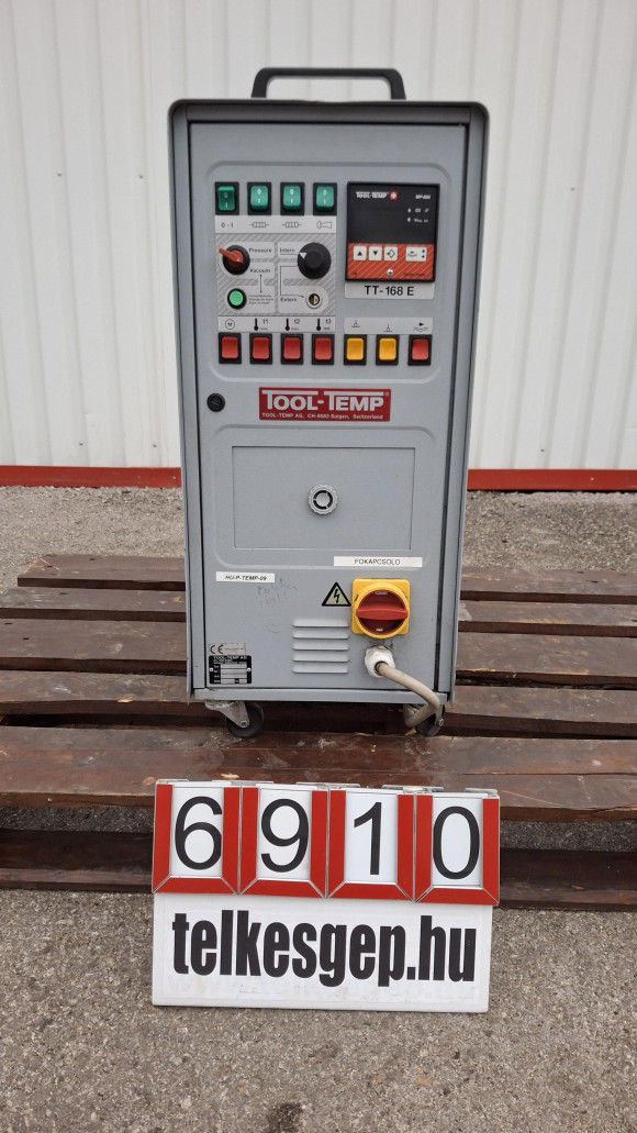 Temperáló,Folyadék temperáló,Ipari temperáló, Thermolator, Tool-Temp TT168 E Gyártó: Tool-Temp Típus: TT 168 E Teljes méretek: 710 × 325 × 785 mm (kerekekkel és fogantyúkkal együtt) Szín: Ezüstszürke RAL 7001 Súly: kb. 67 kg (üresen) Tulajdonságok: Önoptimalizáló elektronikus mikroprocesszoros vezérlő (MP-888) Digitális kijelző a beállított és tényleges értékekhez Automatikus hőmérséklet-ellenőrzés Elektronikus áramlásszabályozás digitális kijelzővel Automatikus minimum áramlás-ellenőrzés Alkalmas víz és olaj közeghez egyaránt Maximális hőmérséklet-tartomány: Víz: 90 °C Olaj: 150 °C Fűtőteljesítmény: Víz: 12 kW / 18 kW (fokozatok: 3/9, 9/9) Olaj: 6 kW (fokozatok: 3/3) Hűtőteljesítmény: 45 kW 90 °C-on Szivattyúkapacitás: Motor: 0,75 kW Nyomás üzemmód: max. 4,0 bar | max. 60 l/perc Vákuum üzemmód: max. 8 m H₂O Tartálykapacitás: Minimum: 16 liter, maximum: 20 liter Csatlakozások: Közeg: ½" BSP anya Hűtővíz be: ¾" BSP anya (vízszűrővel) Hűtővíz ki: ⅜" BSP apa - További információk