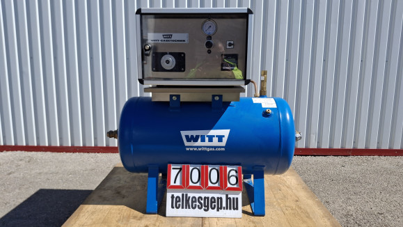 Kompresszor, Witt-Gasetechnik MG50-2ME Pv-Dü, Használt gép Gyártó: Witt-Gasetechnik Típus: MG50-2ME Pv-Dü Befoglaló méret: Szélesség: 1000 mm Mélység: 660 mm Magasság: 920 mm Tartály méret: 100 Liter Tartály max. nyomás: 10 bar Évjárat: 2017 Gáz típusa: CO2/Air Üzemi nyomás: 8 bar Elektromos adat: 230V, Precíz keverés: Nagy pontosságú CO₂ és levegő keverés a „Pv-Dü” (arányos szelep–fúvóka) elv alapján. Beépített puffertartály: 100 literes nyomástartó edénnyel felszerelve a stabil gázáramlás biztosításához. Felhasználás: Ideális élelmiszer-tartósításhoz, mezőgazdasági üvegházak CO₂-dúsításához vagy ipari/laboratóriumi alkalmazásokhoz. - További információk