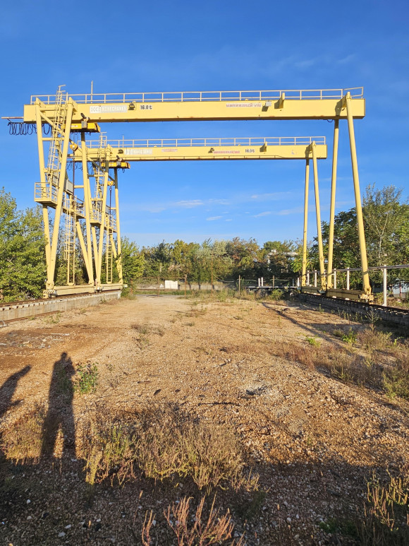 Bakdaru 16t, Portáldau 16t, Konecranes daru 16t, Használt gép Gyártó: Konecranes Gyártási száma : 220331 Emelőmotor : N4 50 Hz Vezérlés : Rádióvezérelt+ függőkapcsoló(helye: talajszint) Év : 2001 Működési hőmérséklet : -20 - +40°c Besorolása : Szabadtéri Súlya : 20t Tűz és robbanásveszélyességi besorolása : C(BM 35/1996) Fesztáv : 20 m Üzemszerű emelési magasság : 11,5m Emelési sebesség (2 sebesség) :5m/perc; 0,8m/perc Macska haladási sebesség(2 sebesség) : 25m/perc; 6,3m/perc Daru haladási sebessége (fokozatmentes, frekvenciaváltó) : 32m/perc ; 1,28m /perc Sodronykötél : Horganyzott Átmérő : 9 mm Hossz : 94 m Szakítószilárdsága : 2160 N/mm2 Emelőhorog : 16t 6 RSN DIN 15401 Gyártási száma : 5168/01/1 Elektromos adatok : 400 V ; 50 hz ; 23,1 kW Az ár egy darura vonatkozik. - További információk