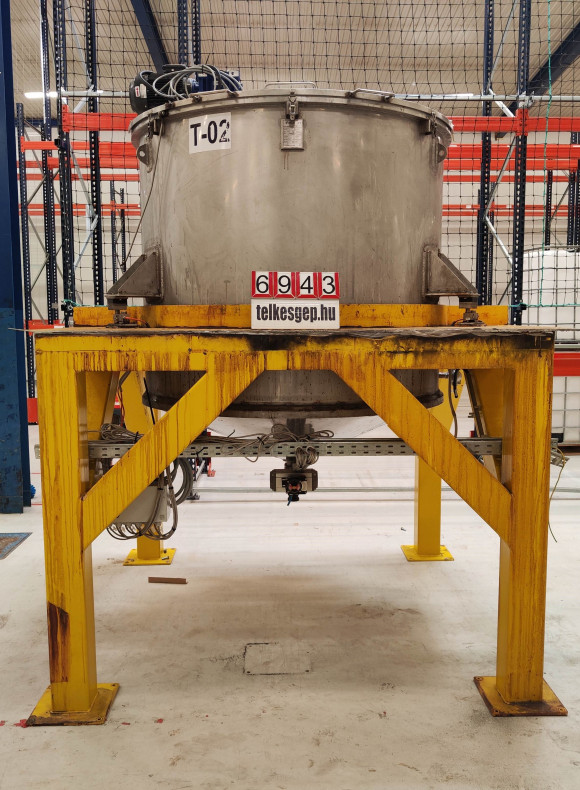 Vegyipari keverő, saválló keverő,Keverő tartály, Vegyipari keverő 2000 l, használt gép Gyártó : Chemplex Típus : T240 Elektromos teljesítmény : 20 kW fűtés , Keverő : 3 kW Súlymérés kiértékelője : MS-h10/kn, MS-CT-SQB - Maximális súlymérés 3500 kg Maximális fűtés : 80 c Kapacitás : 2000 l Leírás: Chemplex gyártmányú 2T kapacitású általánosvegyi keverő, tartálymèrleges kialakítással (3db erőmérővel és kijelzéssel). A tartály atmoszfèrikus tartály, DN100 leömlővel. Fűtése 20kW villamos fenèkfűtèssel van ellátva. Keverő egy propeller keverővel van ellátva. Sík fedèllel, melynek fedele nyitható és vèdőráccsal van ellátva. Fedelében 4db beadagoló csonk található. Javasolt üzemi hőmèrsèklet 20-60C. Az alsó lefejtő csonkra szerelt saválló gömbcsappal van ellátva, ami pneumatikus forgatóművel és buborèk visszajelzövel van ellátva. A forgatómű rugóelőfeszítèses, így a gömbcsap safety closed funkcióval van ellátva. - További információk